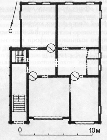 Вход с лестницей через длинный тамбур ведет в коридор, расположенный перпендикулярно центральной планировочной оси дома. По сторонам коридора размещаются комнаты, обращенные во двор и на улицу. Две из них — парадные, примыкающие к главному фасаду. Из коридора имеется ход на лестницу в подвал.