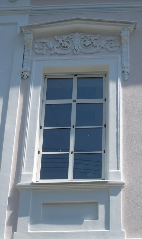 В местах разрыва карниза поле тимпана продолжено до линии наличников и арочного завершения главного входа. На его гладкой поверхности выделяется лепной орнаментальный узор в клеймах.