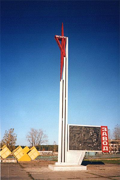Стела у проходной завода, фото: http://prvregion.narod.ru/data/hstpm/iskra_z.htm