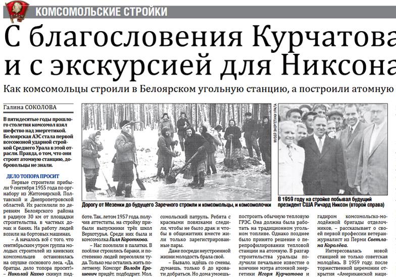 "История. Заречный – город молодой. Еще в 1954 году здесь был лес. А геологов послали на изучение обстановки: где в Свердловской области построить атомную станцию. В результате исследований подходящих мест нашли четыре. В Каменском районе, в окрестностях Камышлова, на берегу реки Сысерть в районе Верхней Сысерти и в Белоярском районе, на реке Пышма. Геологи убедили комиссию остановиться на Белоярском районе. После промера протоков воды стало ясно, что здесь можно создать крупное водохранилище. Плюсом стали и жесткие берега из гранитных пород. Расчеты показали, что здесь строить будет дешевле. В 1955 году началось строительство. Первые строители жили в лесу, в палаточном городке. Зима, кстати, выдалась суровая, до 48 градусов доходило. Позже образовался рабочий поселок, на строительство АЭС съезжалась со всех регионов СССР молодежь по комсомольским путевкам – была объявлена комсомольская стройка.