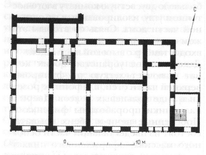Каменный, одноэтажный на цокольном этаже-полуподвале; на западной стороне — выступ, а юго-западный угол срезан.