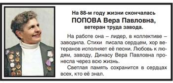 Сообщение о кончине ветерана труда Первоуральского динасового завода, поэта и общественного деятеля Веры Павловны Поповой (1937-2024).