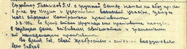 1900 – 1959 Рядовой. Пулемётчик. Сапёр. Боевой путь – от Москвы до Берлина. О своём отце, рядовом солдате Великой Отечественной войны, нам рассказала его дочь, бывшая работница механического завода Анна Петровна Пасынкова: «Повестку на фронт Пётр Илларионович Пасынков получил в первые дни войны. Пришлось сугубо мирную профессию столяра сменить на пулемётчика. Что только не пережил и не перевидел за войну солдат Пасынков. В 1943 году семья получила извещение о его смерти. А через два месяца из госпиталя от Петра Илларионовича пришло письмо. Не убит, а только тяжело ранен. После излечения переквалифицировался, стал сапёром. Ещё дважды был ранен. Прошёл всю войну, от Москвы до Берлина. В 1945 году инвалидом I группы, весь израненный, искалеченный, но живой вернулся домой. До 1959 года, до самой смерти, работал на механическом заводе столяром». Вот так. Трижды ранен, и все три раза – тяжело. Инвалид I группы, а вынужден был работать – семью-то кормить надо было солдату! Работал он, как и воевал, хорошо. Об этом даже в своё время писала городская газета «Большевик». Ну а что воевал хорошо, судите сами: ордена Славы III степени, Красной Звезды, медаль «За боевые заслуги», знак «Отличный сапёр» сияли на его поношенном солдатском кителе...