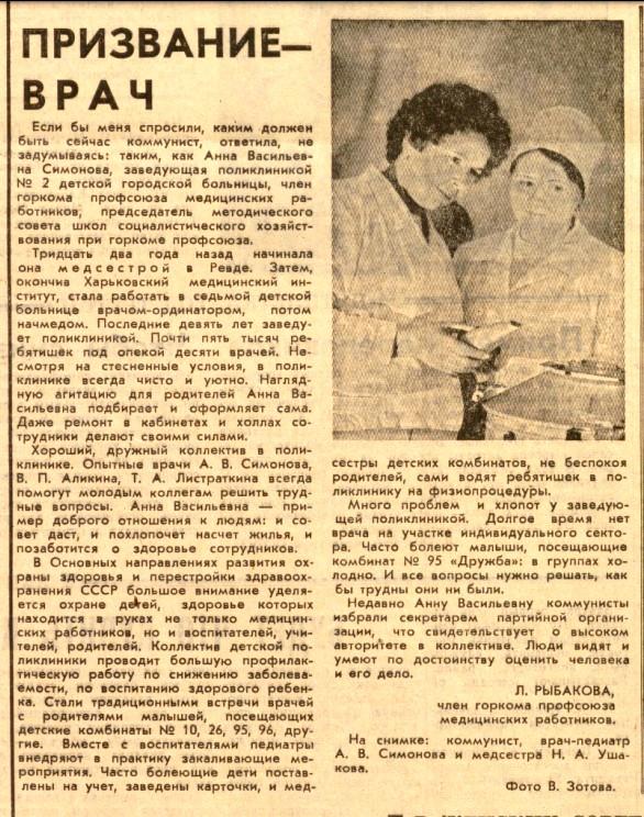 Очерк о заведующей поликлиникой № 2 детской горбольницы г. Первоуральска Анне Васильевне Симоновой.