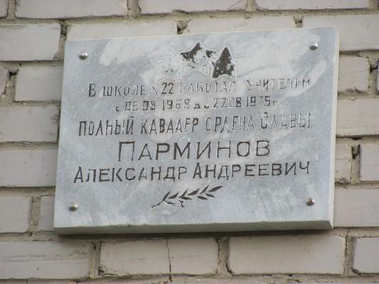 | Мемориальная доска, посвященная полному кавалеру ордена Славы и учителю А. Парминову, установлена на стене школы № 22 в пос. Билимбай. |