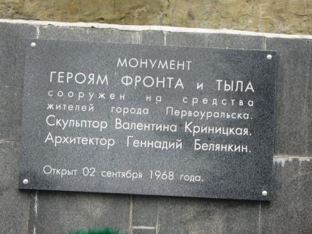 | В 2013 году памятник "обновили", перекрасив в золотой цвет, так же появилась мемориальная доска с надписью: "Монумент ГЕРОЯМ ФРОНТА И ТЫЛА сооружен на средства жителей города Первоуральска. Скульптор Валентина Криницкая. Архитектор - Геннадий Белянкин. Открыт 02 сентября 1968 года." |