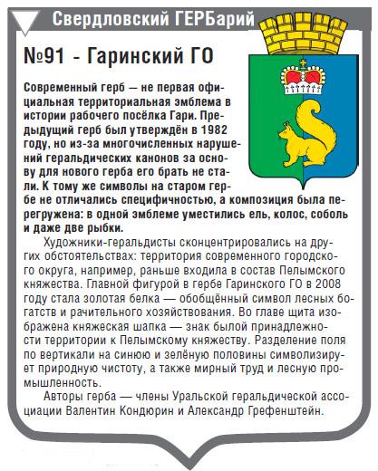 №91 - Гаринский ГО : [о гербе городского округа] // Областная газета. — Екатеринбург. - 2015. - 10 сентября (№ 165). - C. V : ил. - (Свердловский ГЕРБарий).